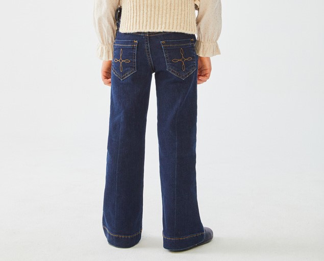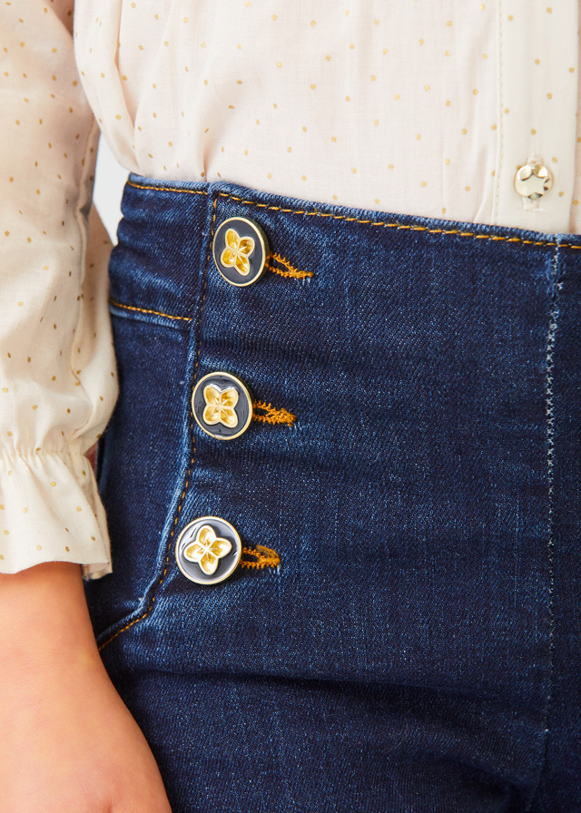 Pantalón largo tejano niña Abel y Lula. Bonitos broches tipo «joya» delanteros decorativos (no funcionales). Bolsillos laterales y traseros funcionales. Goma interior para mejor ajuste. Art.5748